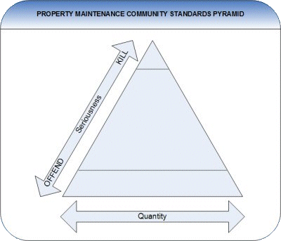The variety of property maintenance issues can be represented by a pyramid. At the top, there are few issues that can directly or indirectly be life-threatening. Then as the life-safety seriousness of the issues gets less, the quantity increases all the way to the bottom where there are many issues that offered individuals but do not constitute code violations. We perform code compliance at the level the community expects and can readily afford.